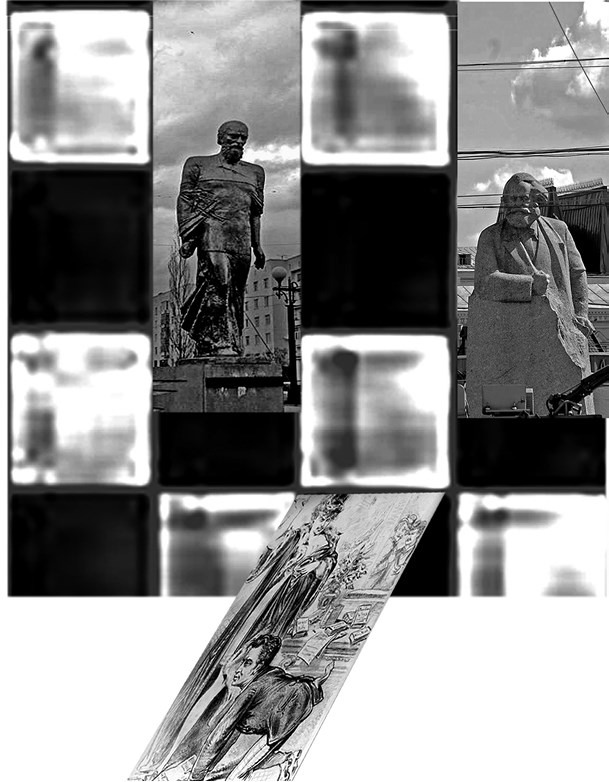 Рис. 9. Светлана Бойм. Шахматный коллаж, сочетающий в себе фотографии памятника Достоевскому в Омске, Россия, и памятника Марксу в Москве, Россия, с карикатурой XIX века на Захер-Мазоха и «диалектику взаимоотношений господин – раб»