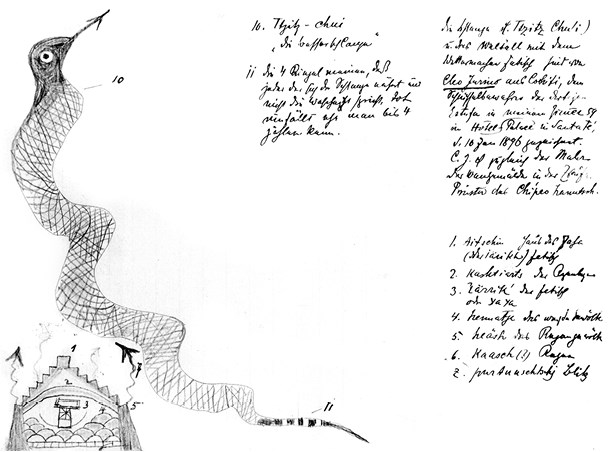 Рис. 5. Рисунок Клео Юрино, изображающий змея и «дом-мир» индейцев пуэбло с примечаниями Аби Варбурга. Фото: The Warburg Institute