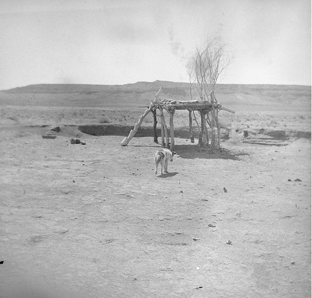 Собственные фотоснимки Варбурга, посвященные архитектуре дома-мира, весьма примечательны тем, что они отличаются от принятых в этнографии стандартов фотофиксации – прежде всего своими странными, нецентрированными композициями и обилием теней (рис. 6–7). Они напоминают работы фотографов начала XX столетия, в особенности Жака Анри Лартига и Эжена Атже[198]; на них схвачены образы движения и быстротечности времени, они отмечены модернистской чувственностью. Мы смотрим на одну из фотокарточек и узнаем образ дома-мира в простейшей хижине, сконструированной из деревьев, расположенной на заднем плане снимка; на переднем плане от фотографа убегает собака – так, будто она стремится укрыться в прохладе длинных предвечерних теней. Три сделанных Варбургом фотоснимка навязчиво не дают нам покоя обилием пустых пространств, которые зачастую располагаются на переднем плане изображения: покрытый трещинами темный фон стены храма, который зрительно разделяет зигзагообразную роспись дома-мира и лица женщин-хопи, игра теней под сенью святилища. Здесь они не маркируют меланхолию, но становятся пространством рефлексии, в котором признаются достоинства и различия, а также частью общего пространства модерна, – что и фиксируют сами фотографические карточки. Варбург добавляет собственные образы к снимкам коренных американцев, становясь соавтором их репрезентации дома-мира.