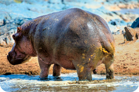 Hippos don’t drop their poop like most animals. When a hippo has to go, its tail starts swishing back and forth very fast. Then the hippo lets loose with an explosive shower of poop. It flies through the air and covers everything. It’s called a dung shower.