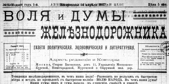 Шапка газеты «Воля и думы железнодорожника». 16 апреля 1917 г.