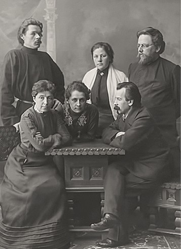 Создатели Народного дома и Общества по распространению начального образования в Нижегородской губернии: Зинаида Штюрмер, Екатерина Пешкова, Павел Малиновский (сидят); Алексей Горький, Елена Малиновская, Ричард Штюрмер (стоят). 1903 г.