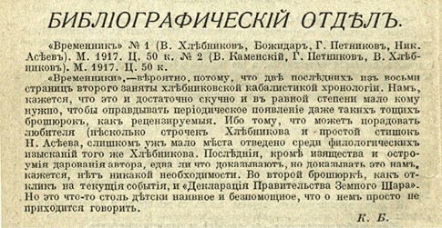 Высокомерная рецензия в журнале «Клич» (1917. № 3. С. 48) на альманах «Временник», в котором среди прочего опубликованы математические пророчества Хлебникова о революции 1917 года
