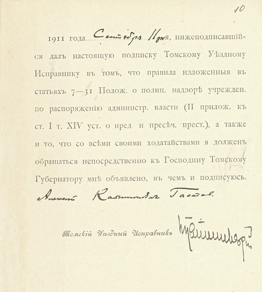 На листе 10 из дела о высылке Гастева сохранилась его подпись.