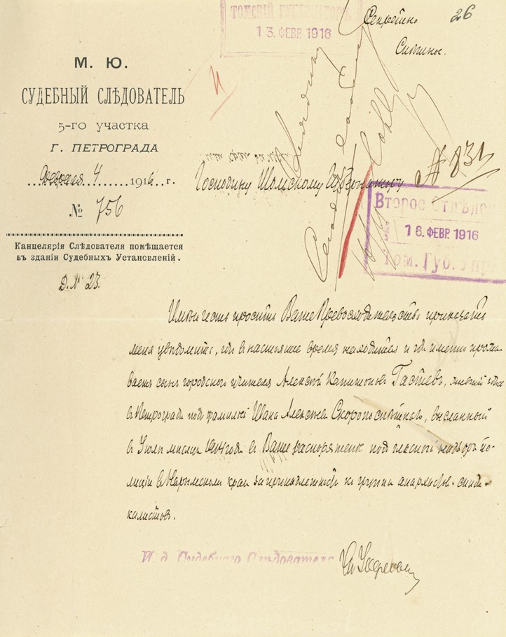 Гастев в 1916 г. был выслан в Нарымский край под гласный контроль полиции за принадлежность к группе анархо-синдикалистов.