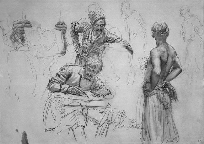 Рис. 5. И. Е. Репин. Эскизы к картине «Запорожцы пишут письмо турецкому султану» (запорожский казак в шапке; писарь; запорожский казак с обнаженной грудью; мужская фигура в профиль), конец 1880-х годов (на эскизе указана ошибочная дата). Бумага, графитный карандаш. 25x34,8 см. Государственная Третьяковская галерея, Москва