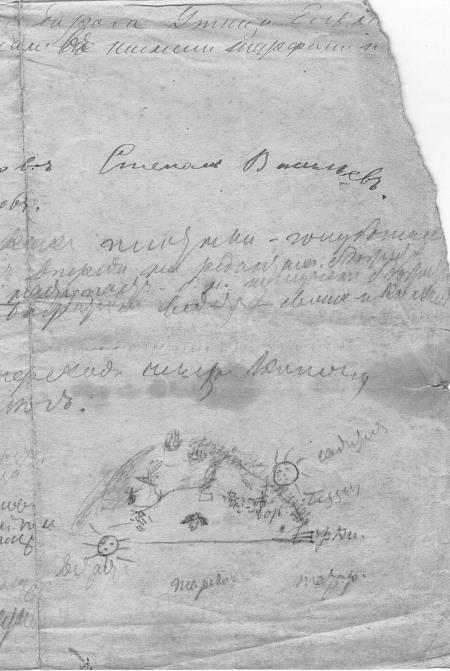 Рис. 6. Л. Н. Толстой. Черновая запись о поездке в Бородино 25–27 сентября 1867 года (фрагмент). Текст и рисунок Л. Н. Толстого, часть текста записана С. А. Берсом. Отдел рукописных фондов Государственного музея Л. Н. Толстого, Москва, Ф. 1, Рукопись 23, № 9194/21