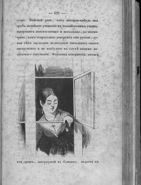 Познакомив читателя с шарманщиком, рассказчик Григоровича советует «наблюдать за ним на улице» [Физиология Петербурга 1991: 51]. Поворачивая ручку инструмента и наполняя улицу звуками, музыкант устремляет свой взор на окна домов. Рассказчик требует: «Посмотрите!» И затем он отвечает на свой приказ описанием того, что именно видит музыкант: молодую женщину, высунувшуюся из открытого окна, для того чтобы бросить монетку. В этот момент опять вступает Ковригин, который дополняет текст Григоровича иллюстрацией с изображением женщины (см. рис. 9). Хотя эта женщина может показаться двойником по отношению к нам, читателям (она, в конце концов, тоже является зрителем), на самом деле она служит читателю физиологического очерка довольно плохим примером для подражания. Бросив деньги шарманщику, она закроет занавески и больше никогда о нем не вспомнит. Читатель же, напротив, последует за музыкантом дальше, пройдет с ним по улицам города, будет наблюдать за его игрой – ив дождь, и в солнце – и узнает больше о его жизни. Для этого очерку требуется не просто зритель, а подвижный зритель. Не имея ничего похожего на сюжет, очерк движется вперед, фокусируя повествование на фигуре прогуливающегося рассказчика. И это происходит по причинам как эстетическим, так и социальным. Подталкивая читателя вперед, рассказчик может дополнить визуальные образы ходом повествования, что создает более полный образ. В то же время, усложняя то, что в противном случае было бы художественным подглядыванием за жизнью и обитанием музыканта, такое развитие повествования выполняет свое дидактическое и социальное предназначение.