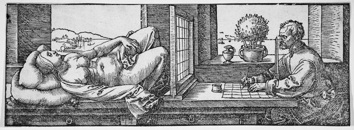 Рис. 14. А. Дюрер. «Художник, рисующий лежащую женщину», 1525. Гравюра на дереве, 7,7x21,4 см. Музей Метрополитен, Нью-Йорк