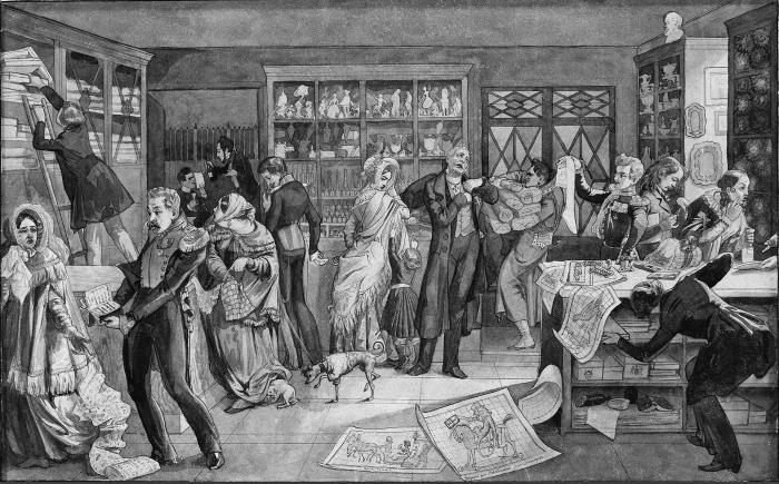 Рис. 17. П. А. Федотов. «Магазин», 1844–1846. Бумага, сепия, перо. 32,3x50,9 см. Государственная Третьяковская галерея, Москва