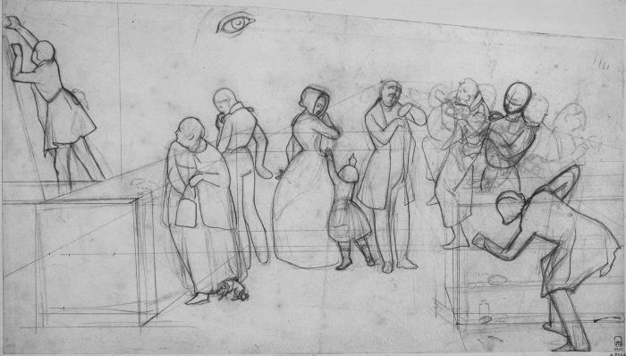 Рис. 18. П. А. Федотов. Эскиз к сепии «Магазин», 1844–1846. Бумага на картоне, графитный карандаш. 27,5x48,2 см. Государственный Русский музей, Санкт-Петербург