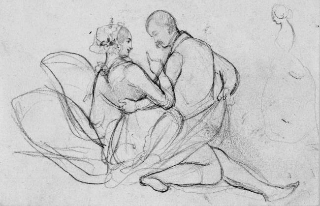 Рис. 19. П. А. Федотов. «Жанровая сцена (П. А. Федотов с дамой). Автошарж», 1849–1851. Бумага, графитный карандаш. 9,6x13,9 см. Государственный Русский музей, Санкт-Петербург