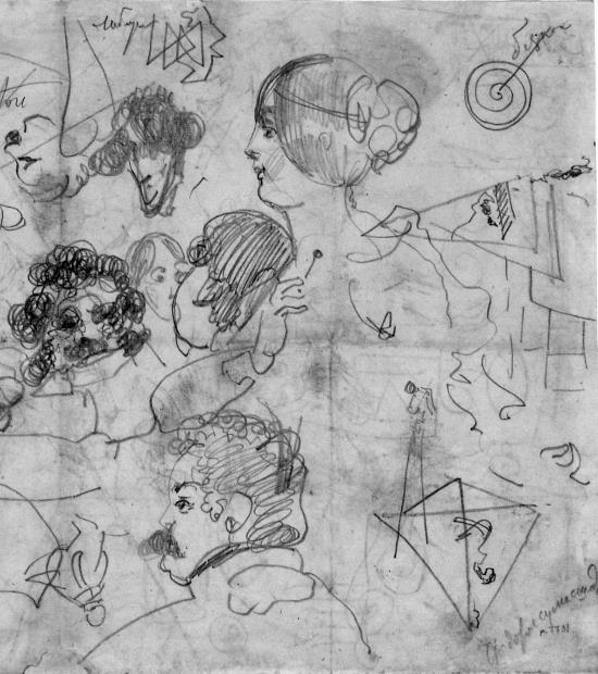 Люди и предметы, так аккуратно расставленные Федотовым в «Сватовстве майора», кажется, преследовали его до самой смерти. Находясь в больнице, художник одержимо нацарапывал что-то в своих тетрадях, о его графомании свидетельствует помятый лист бумаги (рис. 20). Текст и изображение наводняют бумагу до самых границ. Трудно извлечь отсюда многое, но затем мы видим их – и профиль невесты, и кошку из пословицы. В «Сватовстве майора» эти образы попадают в быстрый и замысловатый круговорот рисунка и рассказа: слово уступает место изображению, изображение уступает место слову; но на этом клочке бумаги они не предлагают ничего похожего на изящное перемещение между вербальным и визуальным. Наоборот, разрозненные формы отказываются от чего-либо, кроме самых простых обозначений – женщина, кошка, графические линии и формы не приглашают нас в изображение, а представляют собой непреодолимую стену, навсегда закрывая от нас мир, в котором Федотов запер самого себя.