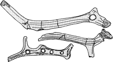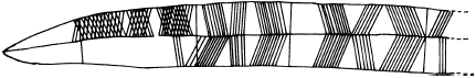 Здесь можно упомянуть о некоторых примерах более современного использования палочек с лунным календарем. Они были известны задолго до того, как Маршак занялся исследованием материалов верхнего палеолита. Он тоже обратил на них внимание в связи со своими собственными идеями, особенно на современные палочки с лунным календарем с Никобарских островов. Эти палочки из белого дерева с зарубками похожи на нож или ятаган, а зарубки расположены на грани и на плоскости. Месяцы отмечаются наклонными значками, а когда все пространство заполнено, последующие месяцы отмечаются поперек прошедших, в результате чего получается перекрестно-штриховой рисунок (рис. 3). Отметки на этих палочках четко показывают дни прибывающей и убывающей Луны.