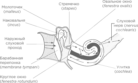 Когда звуковые волны доходят до барабанной перепонки, она начинает двигаться, как кожа на барабане, когда по нему бьют палочками. Это, в свою очередь, запускает движение косточки, расположенной с внутренней стороны барабанной перепонки, – молоточка, или по-латыни malleus. Молоточек прикреплен еще к одной косточке, которую называют наковальней, или incus. А наковальня крепится к последней слуховой косточке – стремечку, или stapes. Поверхность стремечка – это лишь 1/16 часть поверхности барабанной перепонки. Таким образом, вся энергия переходит с барабанной перепонки в крошечную область – и потому возрастает во много раз. Кроме того, слуховые косточки усиливают звук, поэтому во внутреннем ухе энергия фокусируется еще лучше. Благодаря всему этому механическая энергия звуковой волны переходит во внутреннее ухо более эффективно. Человеческое ухо воспринимает колебания, размер которых не превышает диаметр одного атома водорода (наименьшего из атомов из всех химических элементов). Уму непостижимо! Так же невероятно, что наши уши продолжают работать на рок-концерте или возле работающего двигателя самолета: там уровень звукового давления составляет примерно от 130 до 140 децибел, что по силе в триллион раз превосходит порог слышимости – один децибел.