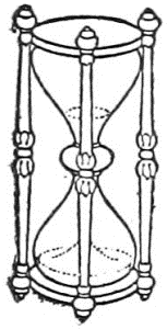 Sand-Glass – (Clepsammia) – A dumb-bell-shaped glass globe containing sand, and with a small aperture through which the sand flows in a certain fixed time. The most common form is the hour-glass but many others are in use as the three-minute glass for boiling eggs, the two-minute glass used by the British Parliament, etc. Dried and finely powdered eggshell sometimes used in place of sand. The principle is the same as that of the simplest form of clepsydra. See Hour-Glass.
