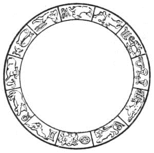 Zodiac – An imaginary belt 16 degrees in width, spread equally on both sides of the ecliptic (q. v.). It is divided into twelve sections or "signs" which receive their distinguishing names from the twelve principal constellations within the belt. That is how the Babylonians learned to tell the time by looking at the sun and the stars. Only their whole problem was vastly complicated by the daily rotation of the earth on its axis, which of course makes the whole sky seem to turn in the opposite direction day by day. The earth turns in the same direction that it goes round the sun, from West to East. So the heavens turn apparently from East to West, while the annual motion, as we saw just now by the illustration of the clock face, appears in its true direction, Eastward. Also, the great clock of the sky is not from our point of view horizontal, but stood up on edge; and not straight up and down even, but slanted at an angle. So its apparent movements are as it were in several directions at once, and the effect is very confusing. The real motions as they actually do occur are very much simpler and easier to understand. But of these the Babylonians had no idea. They knew only what they could see; and it is all the more wonderful that they contrived to reason out so much and so correctly.