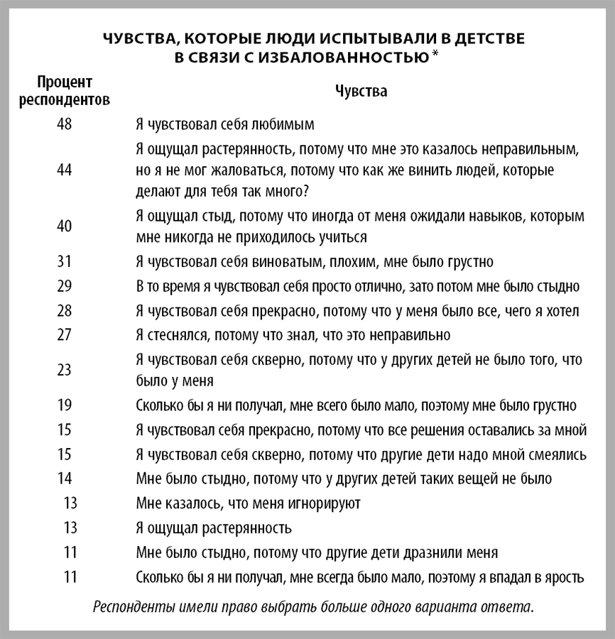 * Исследование И. Тейбла «Чувства детей в связи с избалованностью» воспроизводится с разрешения авторов и издателя по изданию: D. J. Bredehoft, S. A. Mennicke, A. M. Potter, and J. I. Clarke, «Perceptions Attributed by Adults to Parental Overindulgence During Childhood», Journal of Family and Consumer Sciences Education 16, no. 2 (1998): 3–17. © 1998.
