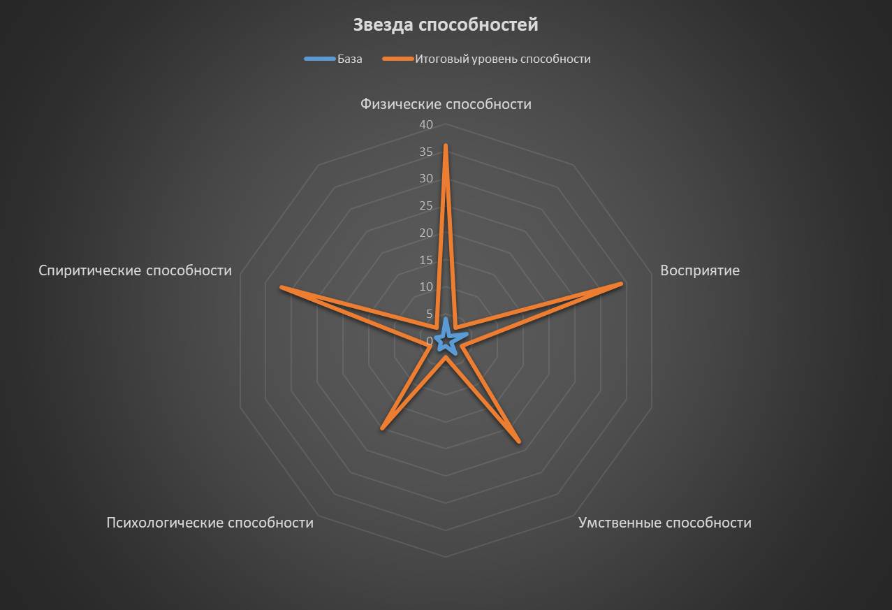 Основные характеристики: физические способности – 36-й уровень; восприятие – 34-й уровень; умственные способности – 23-й уровень; психологические способности – 20-й уровень; спиритические способности – 32-й уровень.