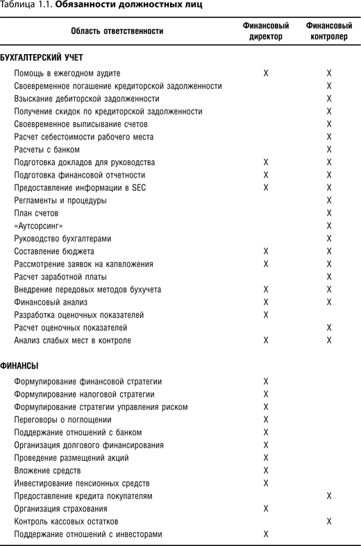 Обсудив, что следует делать финансовому директору, стоит также указать на те области, в которые ему не следует вмешиваться. Это является особой проблемой для финансовых контролеров, которых повысили в должности до финансового директора, но которые имеют трудности с передачей своих старых обязанностей и принятием новых. В результате, имея двойную нагрузку, новоиспеченные финансовые директора плохо справляются и с работой финансового директора, и с работой финансового контролера. В табл. 1.1 представлены функции, которые обычно выполняют финансовый директор и финансовый контролер.