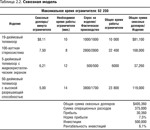 В этом примере мы имеем четыре вида продукции, которую компания может продать. Каждый требует определенного машинного времени ограничителя производительности компании, каковым является процесс производства электрической платы (ППЭП). Первое изделие – 19-дюймовый цветной телевизор, которому нужно 10 минут времени ППЭП. Телевизор продается за 150 долл. и включает прямые материалы на 68,90 долл., что дает сквозные 81,10 долл. Затем мы делим сквозные 81,10 долл. на 10 минут производственного времени ограничителя производительности в расчете на единицу и получаем сквозные доллары в минуту в сумме 8,11 долл., показанные во второй колонке табл. 2.2. Затем мы рассчитываем сквозные доллары в минуту для трех других изделий и ранжируем их в порядке убывания. На первом месте в списке оказался 19-дюймовый телевизор. Затем мы умножаем спрос в единицах на каждое изделие на время, необходимое для пропуска его через ограничитель производительности. Нас интересует не общее время производства каждого изделия, а только время, необходимое для пропуска на проблемном этапе. Затем мы определяем общее время, когда может работать ограничитель производительности, которое в нашем примере составляет 62 200 минут, что показано жирным шрифтом в заголовке таблицы. Далее мы помещаем общее число минут, необходимых для производства каждого изделия, в пятую колонку, которая также показывает, что у нас не будет в наличии достаточно времени ограничителя производительности, чтобы выполнить всю работу для телевизора с высоким разрешением, который имел в списке самый низкий приоритет. Умножая сквозные доллары в минуту на число минут каждого изделия, а затем умножая результат на общее количество произведенных изделий, мы получаем общую сумму сквозных долларов для всего производственного процесса в этот период, составляющую 405 360 долл. Однако это еще не все. Нам необходимо вычесть из общей суммы сквозных долларов сумму всех операционных расходов по этому производству. После такого вычитания мы обнаруживаем, что добились прибыли 7,5 % и рентабельности инвестиций 6,1 %. Это базовая модель сквозной калькуляции.