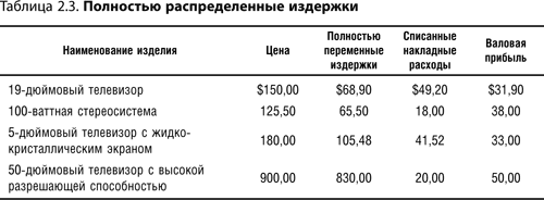 Пока это выглядит как обычный анализ того, сколько денег компания может заработать на производстве определенного набора продукции. Однако здесь можно найти больше, чем представляется на первый взгляд. Это наглядно демонстрирует еще один пример. Предположим, на сцене появляется финансовый директор, который проводит тщательную сквозную калькуляцию всех четырех изделий из предыдущего примера и определяет, что после того как все накладные расходы (overhead costs) надлежащим образом распределены, телевизор с высоким разрешением фактически имеет самую высокую норму прибыли, а 19-дюймовый телевизор – самую низкую. Относительное положение двух других изделий не меняется. Результаты сквозной калькуляции, проведенной финансовым директором, представлены в табл. 2.3.