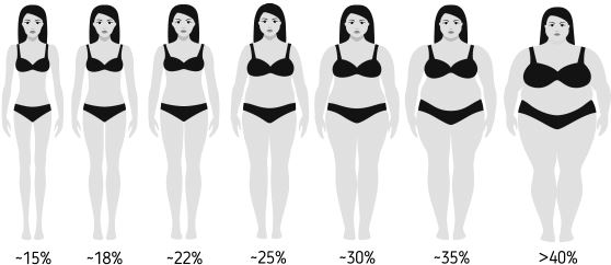Процент жира в телеЭто можно узнать разными способами: пройти биоимпедансный анализ в фитнес-центре или клинике, измерить толщину кожных складок с помощью калипера, но самый простой вариант – сравнить максимально честно свою фигуру с примерами на рисунке 2.