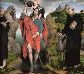 Christophorus mit dem Jesuskind auf der Schulter ist der Schutzheilige der Reisenden (Mitteltafel eines Triptychons von Hans Memling, 1484). Die Heiligenverehrung ist im Volk beliebt
