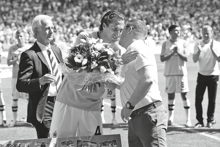 Roel Brouwers wird am 7. Mai 2016 im Borussia-Park von Manager Max Eberl (r.) und Vizepräsident Rainer Bonhof verabschiedet. Foto: Imago/Revierfoto