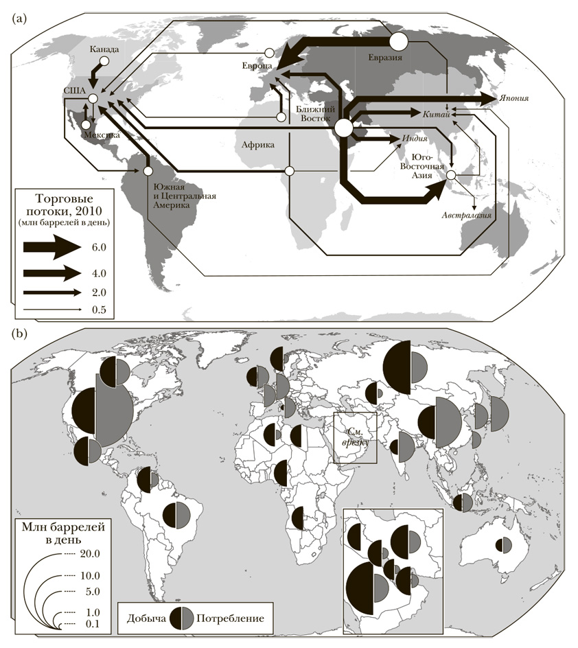 На крайне неравномерную географию глобальных нефтяных запасов накладывается совершенно иная структура промышленного развития и экономического роста. Иными словами, нефть пользуется наибольшим спросом совсем не там, где расположены ее запасы. Спрос на нефть сильно различается от страны к стране (и в их пределах). США, имея 2,4 % мировых запасов нефти и 4,5 % мирового населения, потребляют 21 % всей добываемой нефти. Потребление нефти составляет около 100 баррелей на тысячу человек в день в эмиратах Персидского залива, 68 – в США, 29 – в Великобритании, 6 – в Китае и менее 2 в Кении. Цена на нефть может послужить препятствием для участия в «спросе» и для отдельных людей, и для целых стран. Противоречие между географией запасов нефти и географией спроса на нефть определяет некоторые важные аспекты глобальной политической экономии нефти, которые будут освещены ниже[6].