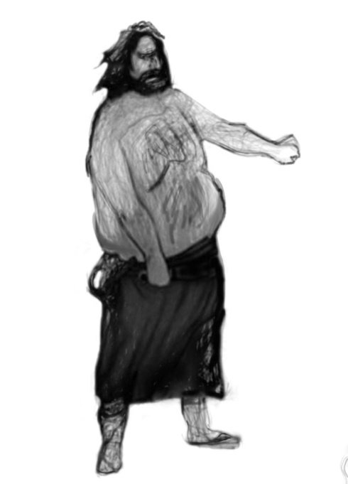 Quando ci avvicinammo alla capanna, la porta si aprì cigolando sui cardini di cuoio e uscì un uomo ripugnante. Indossava solo la parte inferiore di una tunica legata con una corda sotto il suo enorme ventre e un paio di stivali neri. La sua testa con i capelli arruffatiera poggiata su spalle arrotondate, e sembrava che non avesse il collo. Non avevo mai visto così tanti peli su nessuno prima d’ora. Gli coprivano il petto, la pancia e gran parte del viso. Probabilmente anche la sua schiena, ma non volevo vederealtre parti di lui.