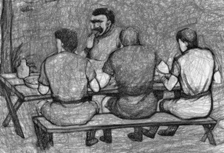 Subito dopo il tramonto, arrivarono due soldati e chiesero di essere nutriti. Riempii le loro ciotole con lo stufato e servii loro fette di melone, insieme a piccole fette di pane. Arrivarono altri uomini e presto tutti i tavoli furono occupati. Mi affrettai da un soldato all’altro con i succosi bocconcini di maiale che Yzebel aveva tagliato.