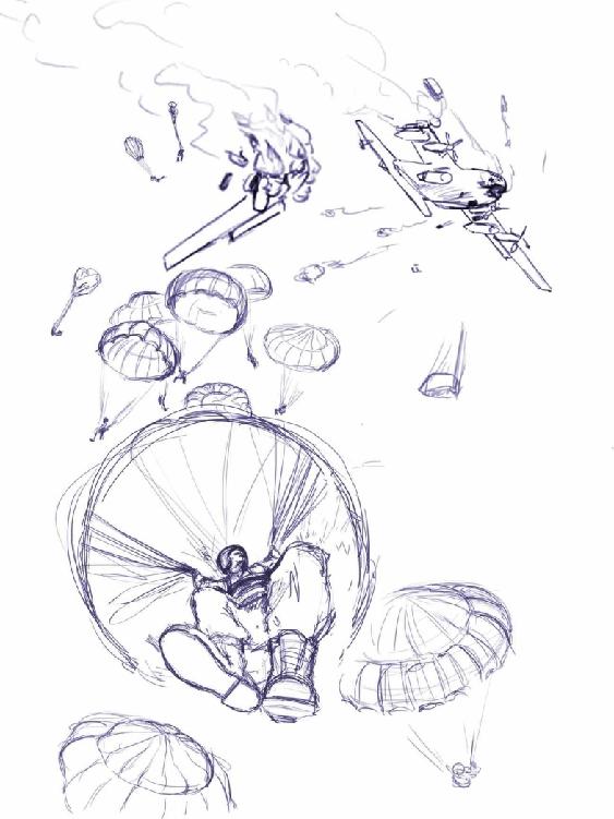 — “Escuchen, gente”, dijo el sargento Alexander. “Tan pronto como lleguen al suelo, abran el paracaídas y agarren su cacharro”.