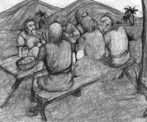 Бостар отнес вино в свою палатку. Когда он вернулся, его руки были нагружены несколькими круглыми плоскими буханками хлеба.