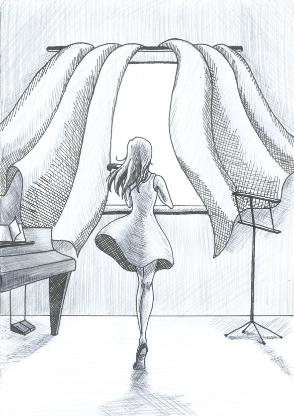 Джон быстро забежал в соседний кабинет, схватил метроном, выбежал обратно в коридор и спрятался за дверью. В коридоре и кабинете все еще стояла тишина. Такое ощущение, что все в этом мире замерло, лишь бы послушать песню скрипки. Теплый солнечный свет, желтые стены, старое фортепьяно, барабанная установка, множество пюпитров. Сухой воздух, запах пыли. Приоткрытое окно, через которое доносилось легкое пение птиц. И силуэт девушки, стоявшей спиной к двери, смычок в правой руке, а скрипка на левом плече. Легкий ветерок слегка развевал распущенные и убранные за плечи волосы.