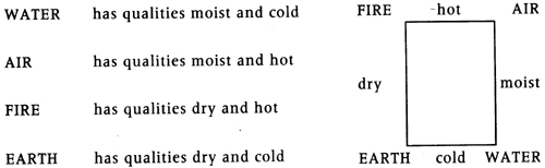Although Aristotle seems not to have articulated a theory of cohesion, we may assume that the four elements were ‘bound together’ by the moist quality. Expressed in rectangular diagrammatic form, which became the basis for later geometrical talismans and symbols, each adjacent element can be seen to possess a common quality; hence all four of the elements are, in principle, interconvertible. Thus, by changing the form or forms (transformation) of bodies, Nature transmutes the underlying basic, or primary, matter into different substances. Despite pertinent criticisms by Theophrastus (371–286 BC), Aristotle’s pupil and successor at the Lyceum, that fire was different from other elements in being able to generate itself and in needing other matter to sustain it, the theory of the four elements was to remain the fundamental basis of theoretical chemistry until the eighteenth century.