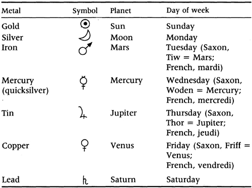 from them the names of the week (table 1.1), as well as beliefs that metals grew inside the earth, to conclude that myth and analogy played the equivalent role of chemical theory in these technologies. Moreover, it seems highly likely from later written records that metallurgists believed that, while metals grew normally at a slow pace within the earth, they could accelerate this process within the smithy, albeit an appropriate planetary god or goddess had to be propitiated by ritual purification for the rape of mother earth. It was this element of ritual, albeit in a Christianized form in the Latin west and a Taoist form in China, that was handed on to the science of alchemy.
