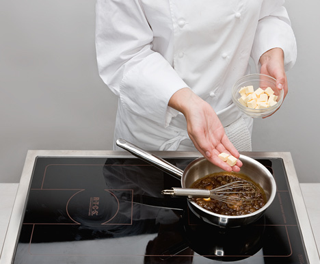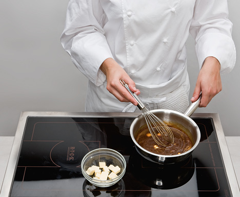 Tip: Add pieces of butter cooled in ice water to hot sauce (ca. 80 °Celsius), carefully, yet constantly, whisking and tossing it until the desired thickness has been reached. Curiously, better thickening results are achieved by gentle stirring and tossing rather than by vigorous whisking.