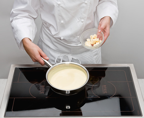 General rule: Cut butter in required quantity into slices or cubes the size of a thumbnail and ca. 2 mm thick. Fold into the hot sauce (approx. 70 °Celsius), stirring vigorously with a whisk or a blender. This vigorous stirring or whisking method results in a certain degree of homogenization. Do not reheat sauce, this would destroy homogenization and the thickening effect: the butter (milkfat) would separate from the sauce and float on top.