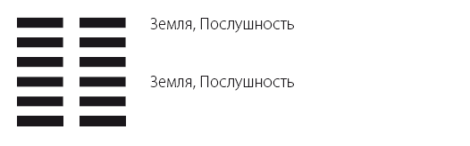 При удвоении трехуровнего знака Земля получается знак ЗЕМЛЯ, Послушность, состоящий из 6 уровней. Так в знаках выражается чистый инь, предельная Послушность. Этому имени и этому образу свойственно отсутствие изменяемости. Самка коня – это Послушность, способная быть неизменной в своем движении. Ян начинает, инь следует, ян управляет смыслом, совестью, инь управляет ценностями. Юго-запад – иньская сторона, северо-восток – янская сторона4. ЗЕМЛЯ – это действие спокойной Послушности.
