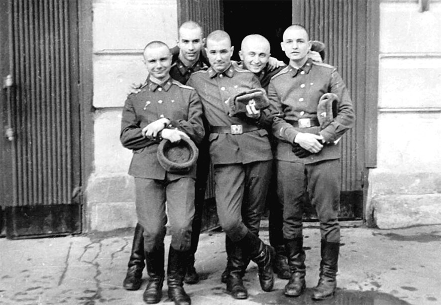 У входа в казарму. Курсанты (слева направо): Казанский, Ежков, Скирта, Ганчук, Пятаков