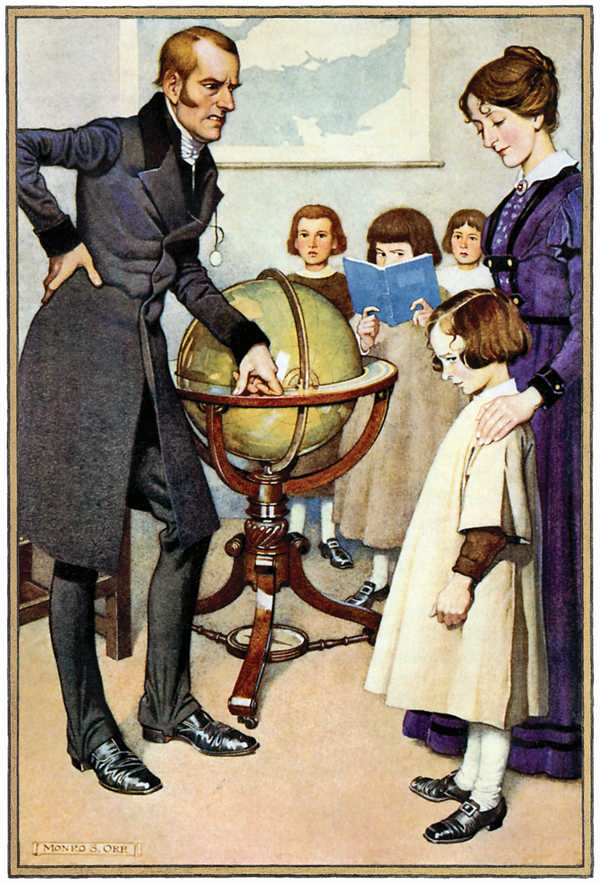 Тем временем мистер Брокльхерст, стоя возле камина с заложенными за спину руками, величественно рассматривал воспитанниц. Вдруг он заморгал, как будто ему что-то попало в глаз, и, обернувшись, сказал торопливее, чем говорил до сих пор: