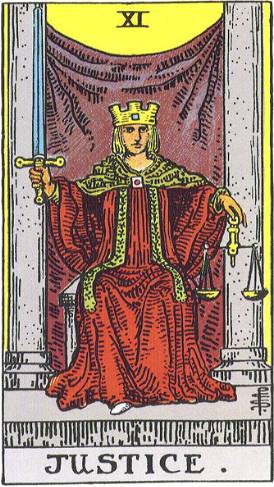 Перспективы -: возможно охлаждение, когда отношения становятся формальными, бытовыми, отношения долга. Также карта может показывать развод (именно официальный, юридически вступивший в силу, потому что карта «Справедливость» – это бумажная волокита).