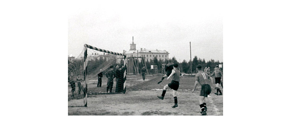1954 г. Со стороны военного городка Уручье любуемся на исторический вид Минского ВИРТУ. Мл. лейтенант Бурцев