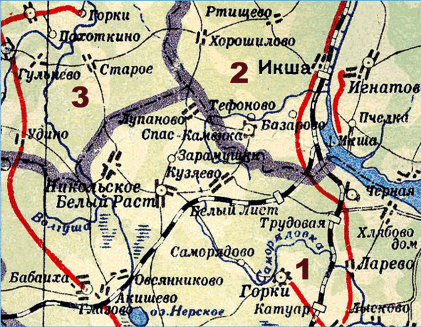 Населенные пункты гп Икша в составе Краснополянского района Московской области в 1939—1960 гг. 1 – Краснополянский район; 2 – Дмитровский район; 3 – Коммунистический район. С карты 1947 г.