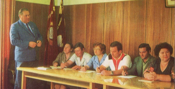 Директор опытного хозяйства Ермолино А. В.Беспахотный проводит совещание, 1985
