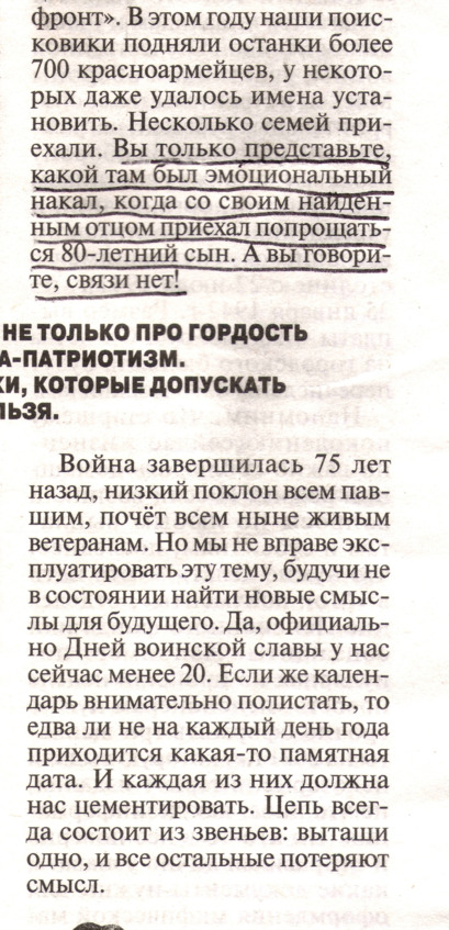 Низкий поклон людям, занимающимся святым делом – поиском неизвестных павших за Родину воинов, дающих возможность их потомкам положить цветы к могилам людей, давшим им жизнь.