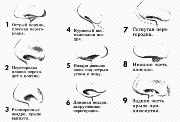 Когда кончик носа направлен вниз, это может указывать на расчетливость, подозрительность и даже жестокость у индивида. Форма кончика носа, напоминающая орлиный клюв, может указывать на мстительность, хитрость и настойчивость. Когда кончик носа имеет ямку или раздвоенную форму, это может указывать на застенчивость, скромность и стремление к лучшему.