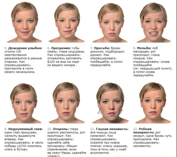 Важно заметить, что улыбка не всегда сочетается с другими выражениями лица и редко бывает, чтобы улыбка не согласовывалась с остальной мимикой лица.