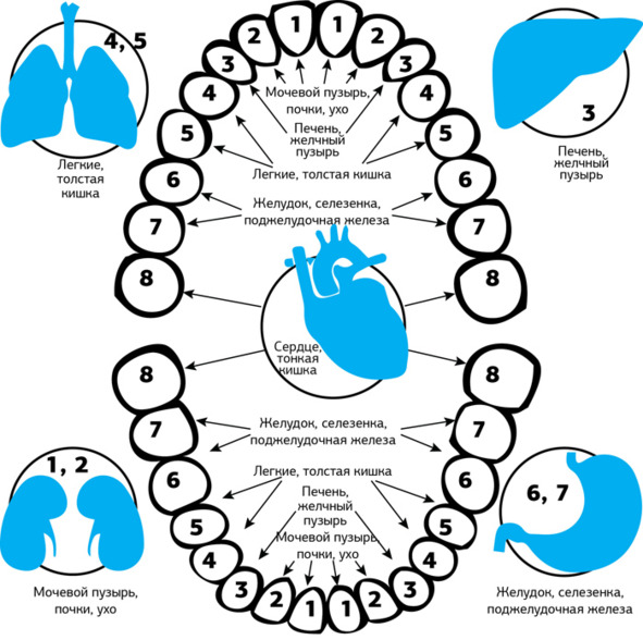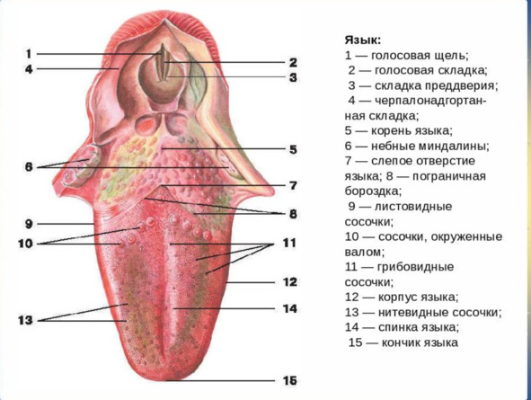 Структура и окраска кончика языка способны отражать состояние внутренних органов, включая сердце, а также тонкий кишечник. Например, симптомы стресса либо тревоги могут проявляться красными либо яркими пятнами на кончике языка, а область за кончиком может показывать на функционал дыхательной, а также иммунной систем. Каждые перемены в данной области способны показывать различные болезни, такие как бронхит, туберкулез, пневмония либо эмфизема.